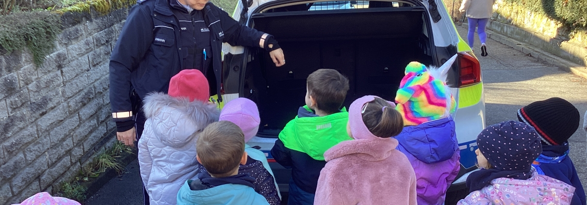 Frau Lehmann aus der Polizeidirektion Heilbronn besucht die Wimmentaler Kindergartenkinder und erzählt über den Beruf des Polizisten/ der Polizistin