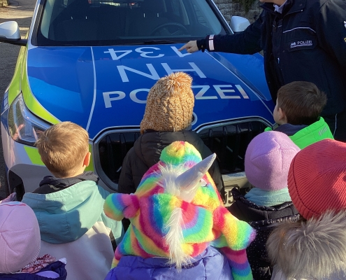 Als die Handschellen zum Vorschein kamen, stellten die Kinder fest, dass diese nicht für die Kinderhände geeignet sind. Sie sind ja viel zu groß und die Arme ohne Probleme wieder herausgezogen werden können. Das heißt: Kinder können von der Polizei gar nicht festgenommen werden. Anschließend lernten wir den Helfer (die Handpupe Luke) von Frau Lehmann kennen. Er erzählte den Kindern, wie wichtig es ist, im Auto immer angeschnallt im Kindersitz mitzufahren. Wenn der Erwachsene nämlich stark bremsen muss, besteht keine Gefahr aus dem Sitz zu fallen und sich zu verletzen. Zum Schluss gingen wir gemeinsam zum Streifenwagen. Dort zählten wir die Löwen auf dem Auto, die für Baden-Württemberg stehen. Die gleichen Löwen, sieht man auch auf Frau Lehmanns Uniform. Als Höhepunkt durfte jedes Kind einmal auf dem Beifahrersitz sitzen. Frau Lehmann zeigte uns auch das Funkgerät, das