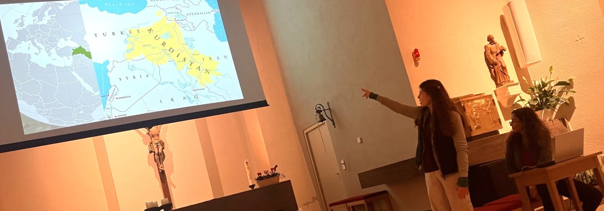 Warum war Sie dort? Was war ihre Intention? Wofür steht sie ein? Das waren Fragen, die wir uns als Gruppe Frauenkirche gestellt haben. Viele dieser Fragen wurden uns in einem sehr lebendigen Vortrag von Lea Bunse beantwortet. In gut besuchter Kirche wurden wir über die schwierigen Verhältnisse der Kurden nach der Teilung ihres angestammten Gebietes auf die Türkei, Syrien, Iran und Irak aufgeklärt. Mit großer Leidenschaft hat sie uns über die Demokratische Selbstverwaltung in Nord- und Ostsyrien, auch bekannt unter dem kurdischen Namen Rojava, aufgeklärt. Deutsch West-Kurdistan, ist ein de facto autonomes Gebiet im Nordosten von Syrien. Rojava entstand ab 2012 infolge der Geschehnisse des Syrischen Bürgerkriegs. Die Referentin Lea Bunse hat uns von dem Leben im Frauendorf Jinwar berichtet, das ausschließlich von Frauen und Kindern verwaltet wird.