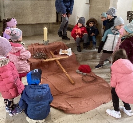 Gut gestärkt machten sich die Kinder mit ihren Erzieherinnen anschließend auf den Weg in die Kath. Kirche. Dort wurden sie von Frau Labenski empfangen und konnten auf anschauliche und kindgerechte Weise die Ostergeschichte erleben. Durch aktives Mitmachen war ihnen die Möglichkeit geboten sich in die Vergangenheit hinein zu begeben.