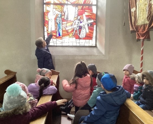 Besonders eindrucksvoll war, dass die Kinder viele Elemente der Geschichte selbst entdecken durften. Sie konnten das Abendmahl mit Brot und Wein betrachten, die Waschung der Füße wurde gemeinsam nachahmen und ein Kreuz sowie eine Dornenkrone aus nächster Nähe ansehen und sogar vorsichtig anfassen. Die Darstellung der Ostergeschichte auf den Kirchenfenstern machte das Erzählte zusätzlich lebendig und gut verständlich.